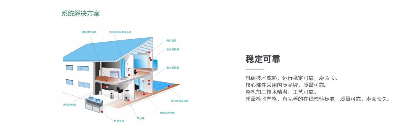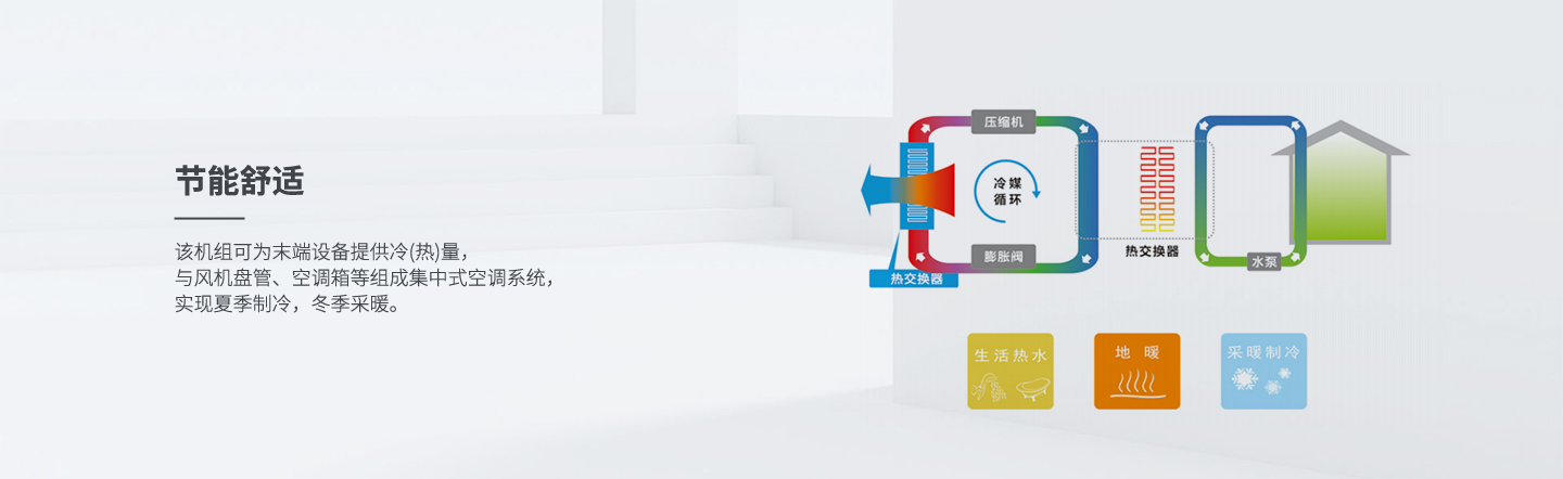 該機(jī)組可為末端設(shè)備提供冷(熱)量, 與風(fēng)機(jī)盤(pán)管、空調(diào)箱等組成集中式空調(diào)系統(tǒng), 實(shí)現(xiàn)夏季制冷,冬季采暖。 天生抗凍,無(wú)懼嚴(yán)寒,適應(yīng)于北方多變的雨雪天氣,一年四季節(jié)能又好用。
