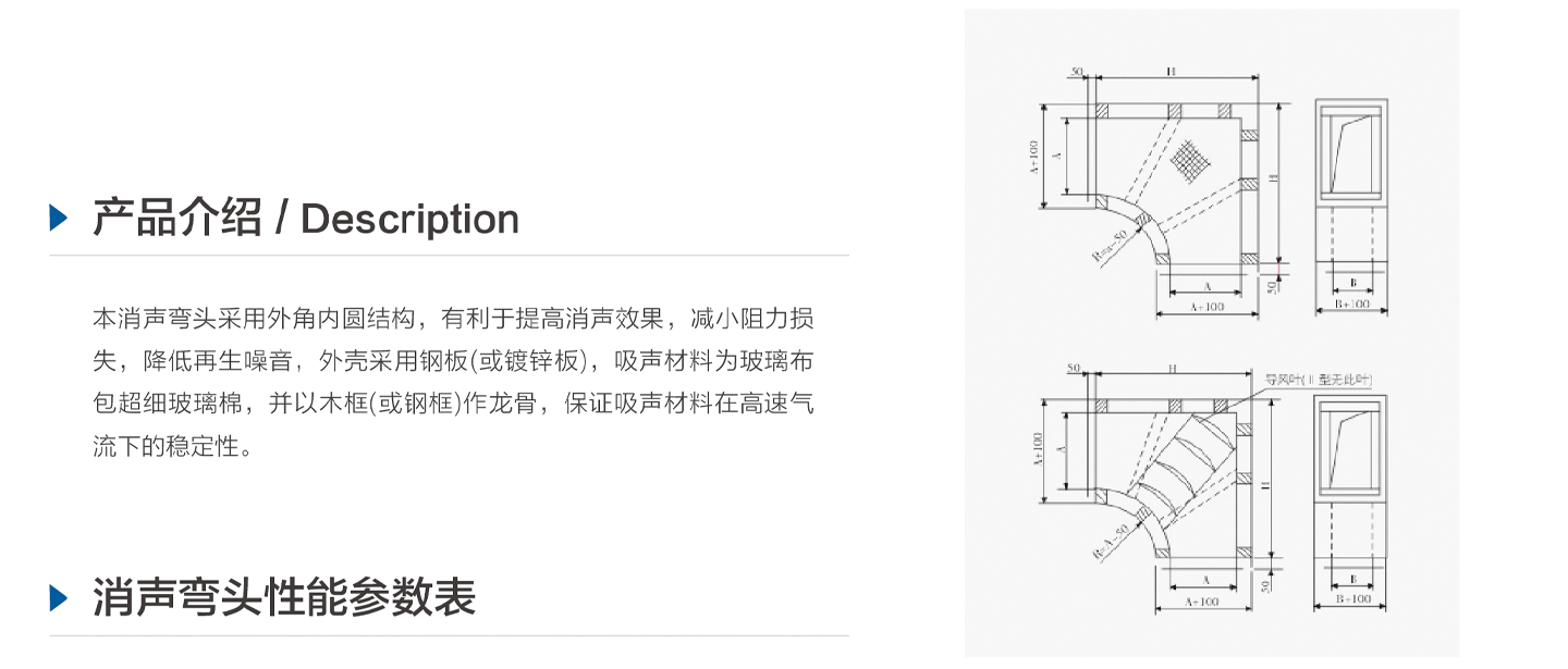 本消聲彎頭采用外角內(nèi)圓結(jié)構(gòu),有利于提高消聲效果,減小阻力損失,降低再生噪音,外殼采用鍍鋅板。 吸聲材料為玻璃布包超細(xì)玻璃棉,保證吸聲材料在高速氣流下的穩(wěn)定性。